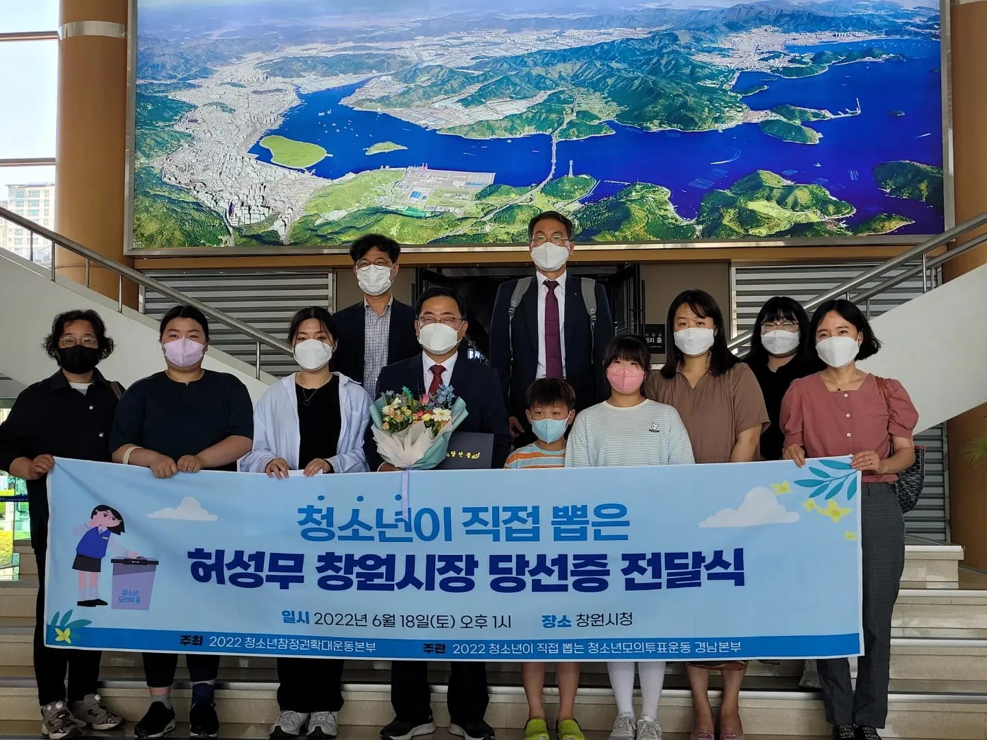 6월 18일(토) 오후 1시 창원시청에서 마산청소년YMCA회원들과 함께 '청소년이 뽑은 허성무 창원시장 당선증 전달식'을 진행하였고, 오후 2시 30분 경남연구원에서 거창, 마산, 양산 청소년YMCA 회원들과 거창군청소년문화의집, 마산청소년문화의집 청소년들과 함께 '청소년이 뽑은 박완수 경남도지사 당선증 전달식'을 경남연구원에서 진행하였습니다.