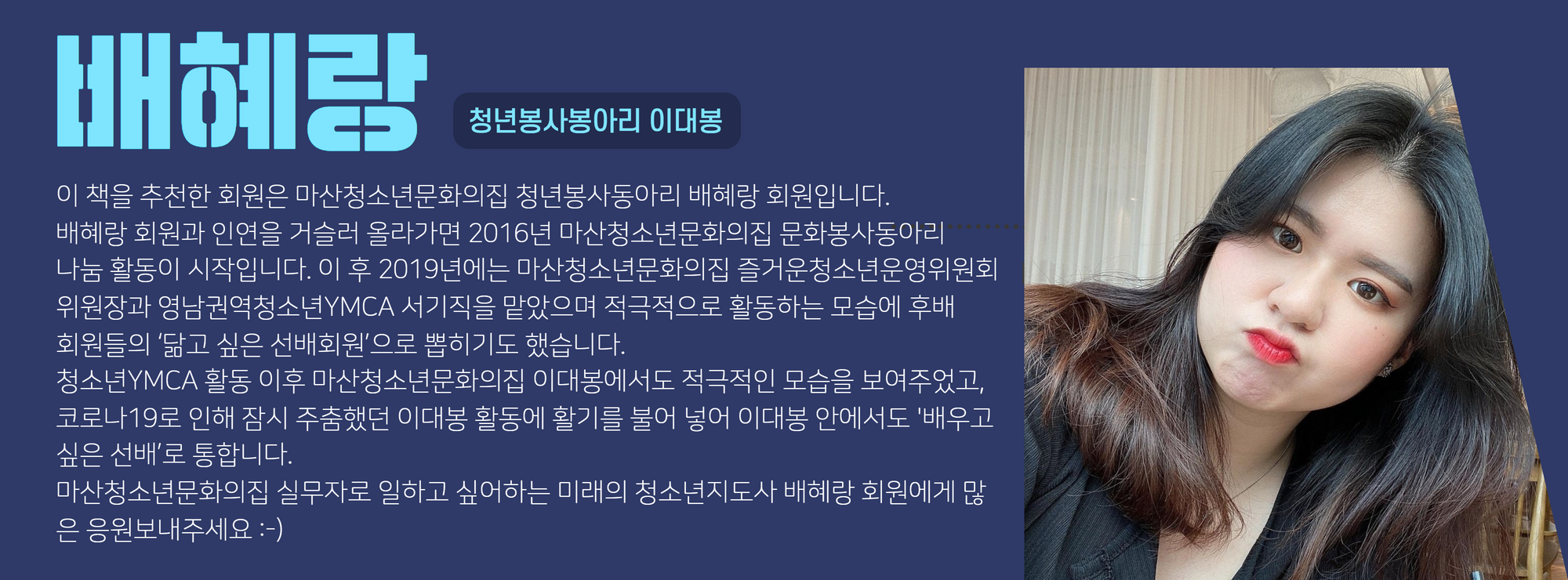추천인: 배혜랑 (마산청소년문화의 청년봉사동아리 '이대봉' 회원)