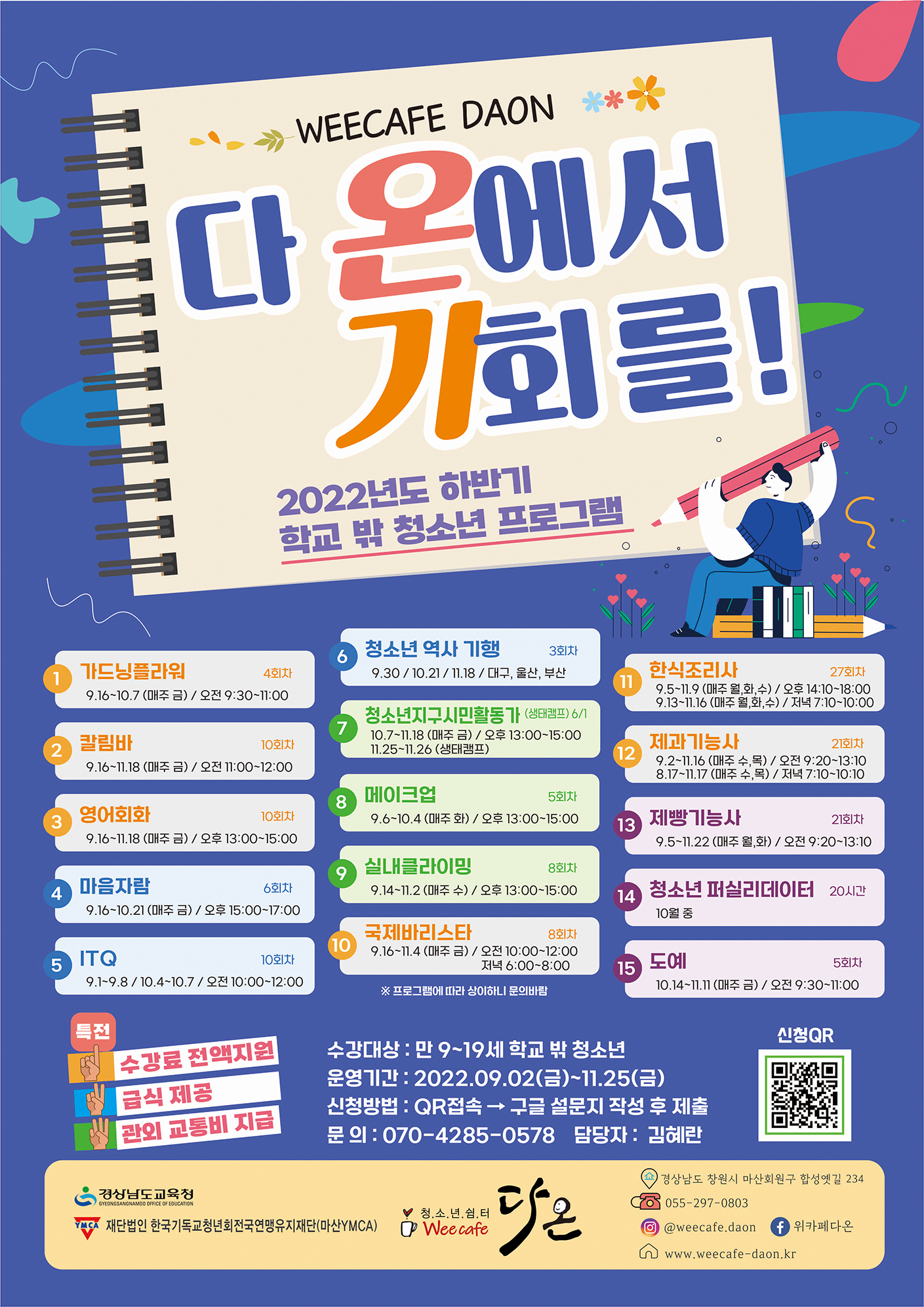 다온의 온기 프로그램은 각종 자격증 수업 비용뿐만 아니라 관외지역(마산, 창원, 진해 외 경남) 교통비, 급식, 방역물품까지 지원하고 있습니다.