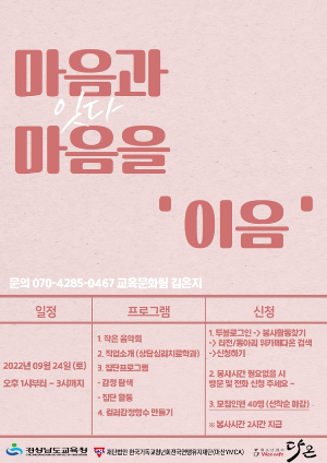 이번 가을마당행사로 준비한 마음과 마음을 잇다 <이음>는 향후 전망 좋은 직업 군 중 하나인 상담 및 심리 관련 학과 재학생들이 청소년들에게 직업 및 학과 소개와 재미난 활동들을 통해 진로 및 자기 탐색의 기회를 제공해주는 행사입니다!