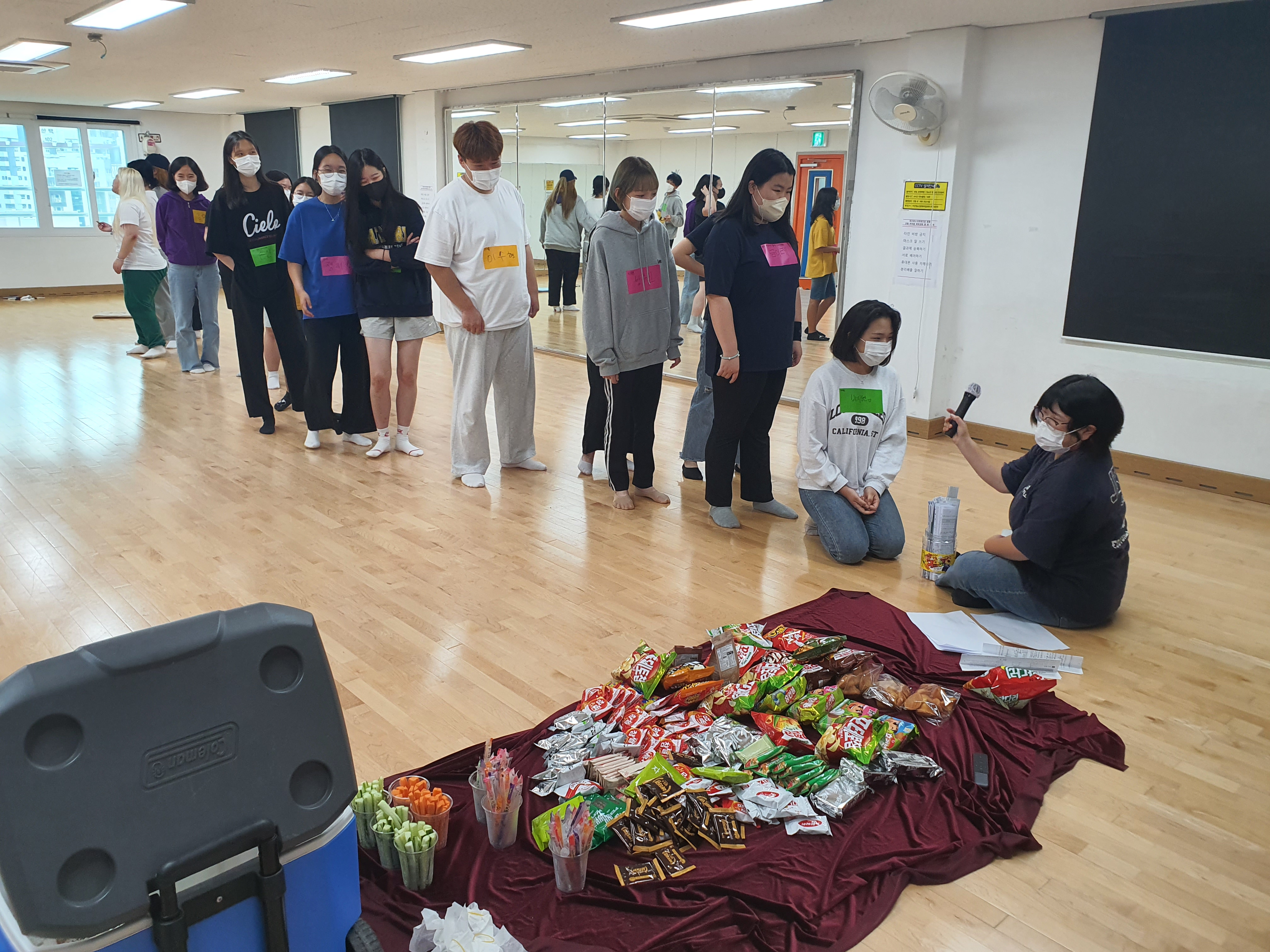 한줄로 서서 문제를 맞추면 원하는 간식을 먹을 수 있는 절호의 기회에! 많은 청소년회원들이 참여하였습니다!