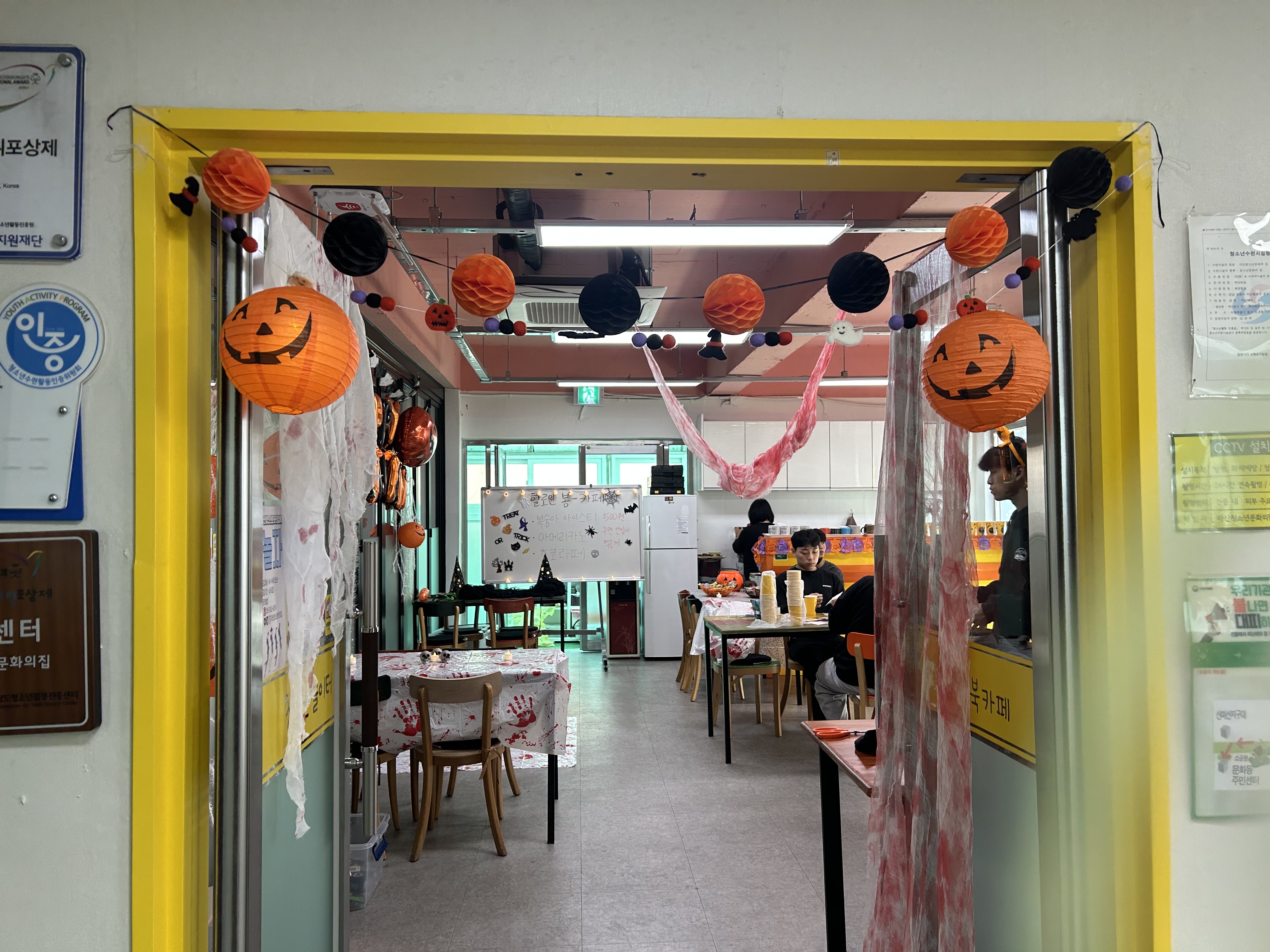 처음 기획했던 대로 할로윈 컨셉으로 준비하였습니다! 마산청소년문화의집의 1층을 전반적으로 다 사용하려고 하였으나, 소소한 카페인만큼 북카페만 이용하기로 결정하고 할로윈컨셉으로 꾸며나가기 시작했습니다.