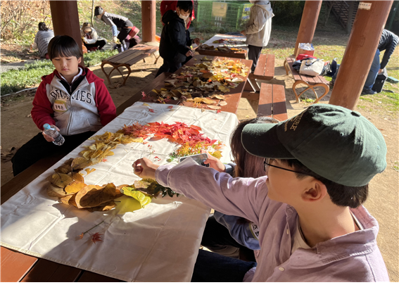 가을 풍경을 실컷 느낀 후 한중권 선생님께서 수목원에 있는 나무들에 대해 설명해주신 후 조별로 낙엽에 시 쓰기, 조별 게임을 진행해 해주셨습니다.