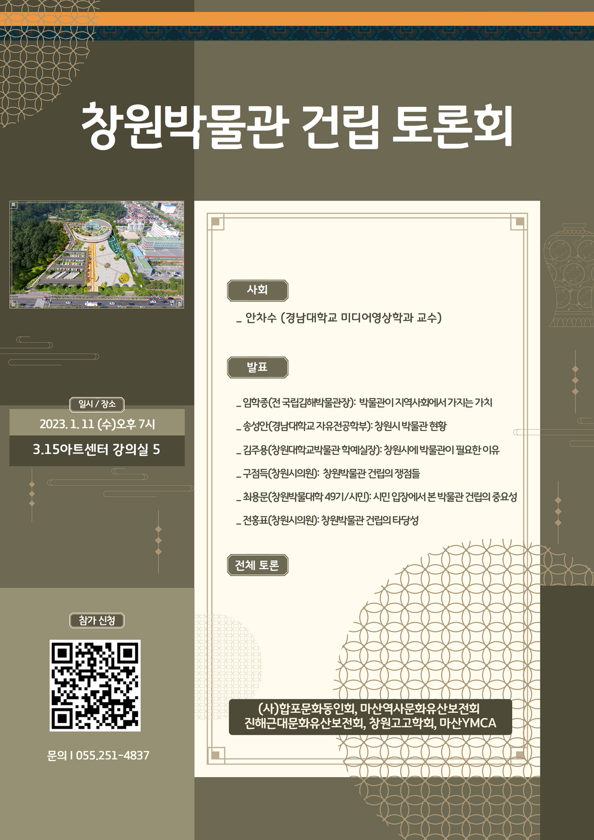 마산YMCA 포함 지역역사 및 문화유산에 관심 있는 기관들의 공동주관으로 ‘창원박물관 건립 토론회’를 1월 11일(수) 오후 7시에 개최합니다. (공동주관: (사)합포문화동인회, 마산역사문화유산보전회, 진해근대문화유산보전회, 창원고고학회, 마산YMCA)