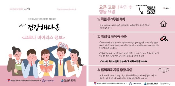 최근 실내마스크착용의무가 완하되며 코로나-19가 한 풀 껵였지만 아직은 코로나의 위협이 존재합니다. 코로나 바이러스에 대한 정확한 정보와 확진 시 행동요령에 대해 정보를 제공함으로써 청소년들이 스스로의 건강을 지킬수 있도록 할 계획입니다.