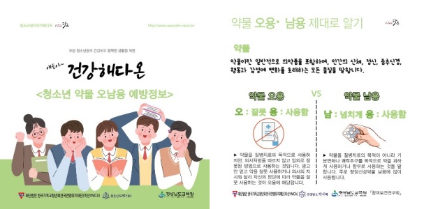 아플 때 가장 먼저 찾는 것이 약입니다.일상생활 속에서 많은 약을 접하지만 그 약이 어떤 성분으로 되어있는지, 정확한 방법으로 복용하고 있는지 궁금할때가 있습니다.<청소년 약물 오남용 예방정보>를 통해 안전하고 올바른 약 복용에 대한 정보를 제공할 계획입니다.