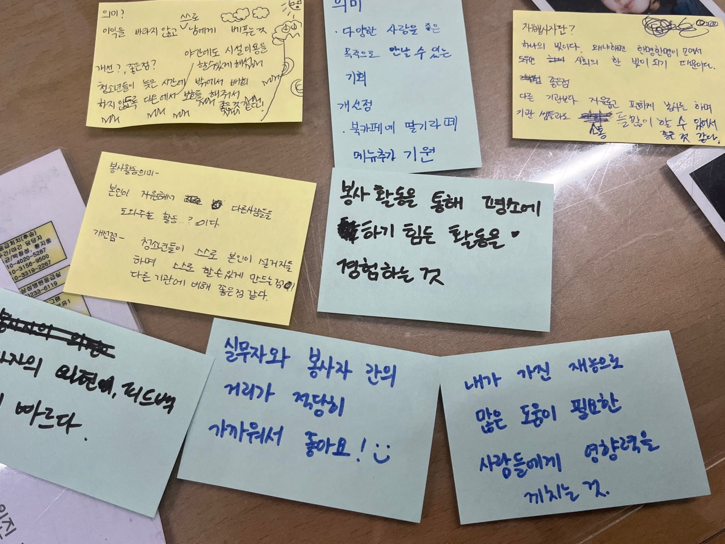 단합회 떠나기 전, 다온에서 봉사활동 후 느낀점, 자원봉사활동에 대한 자신의 생각들을 나눠보고 토론하는 시간을 가졌습니다. 봉사자의 생각들을 들어 봄으로써, 저 또한 봉사자들에게 좋은 영향을 주는 선배이자 실무자가 되어야겠다고 다짐할 수 있었습니다.