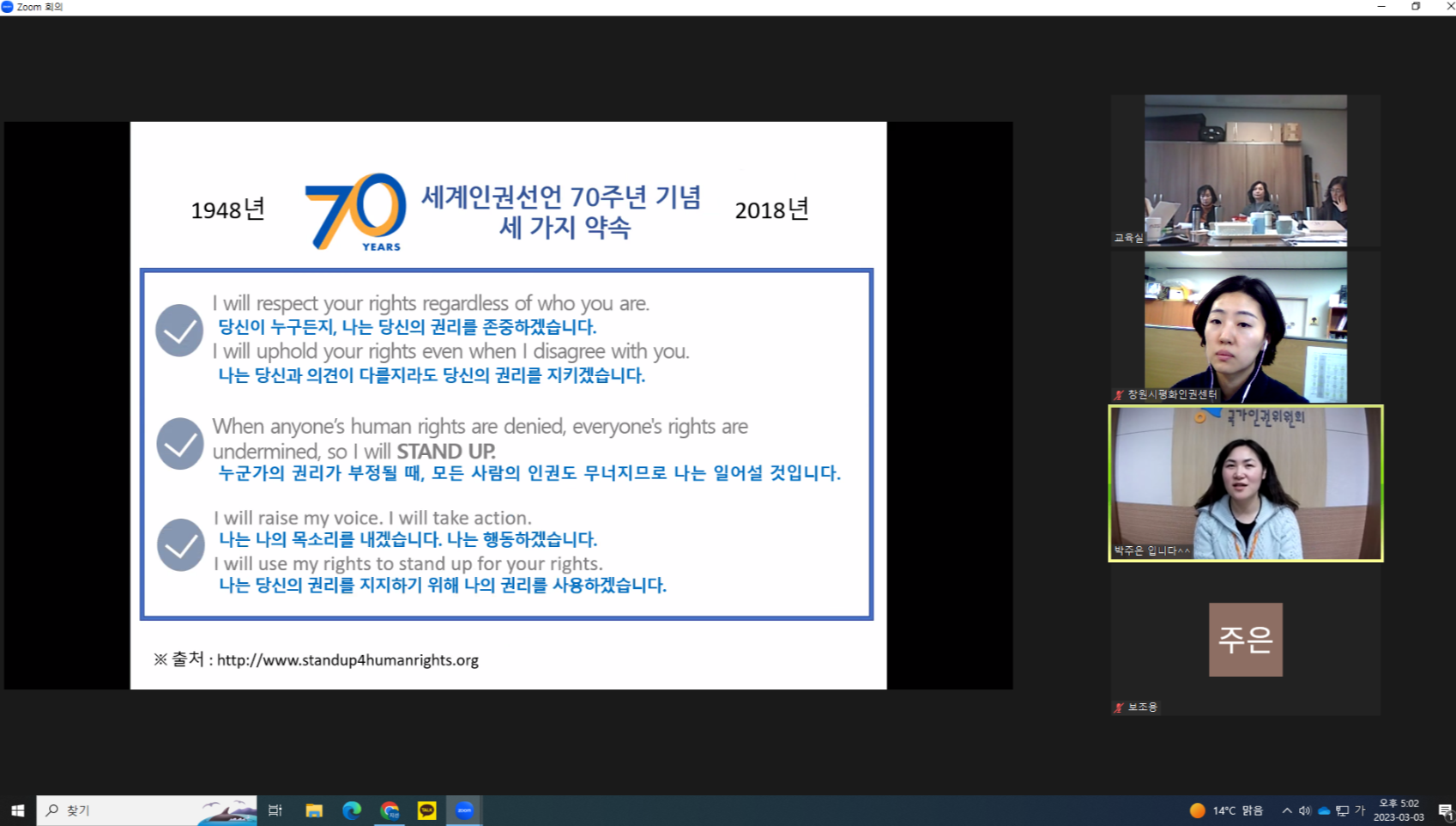 또한 지구시민교육 '세계가 100명의 마을이라면' 활동을 통해 인권감수성과 다양성을 보다 재밌게 고민할 수 있었습니다. 마지막으로 결국 우리가 해야하는 것이 '인권교육'임을 되짚으며 인권에 관한, 인권을 위한 교육, 인권을 통한 교육의 원칙을 박주은 국가인권위원회 주무관님을 통해 알차게 들을 수 있었습니다.