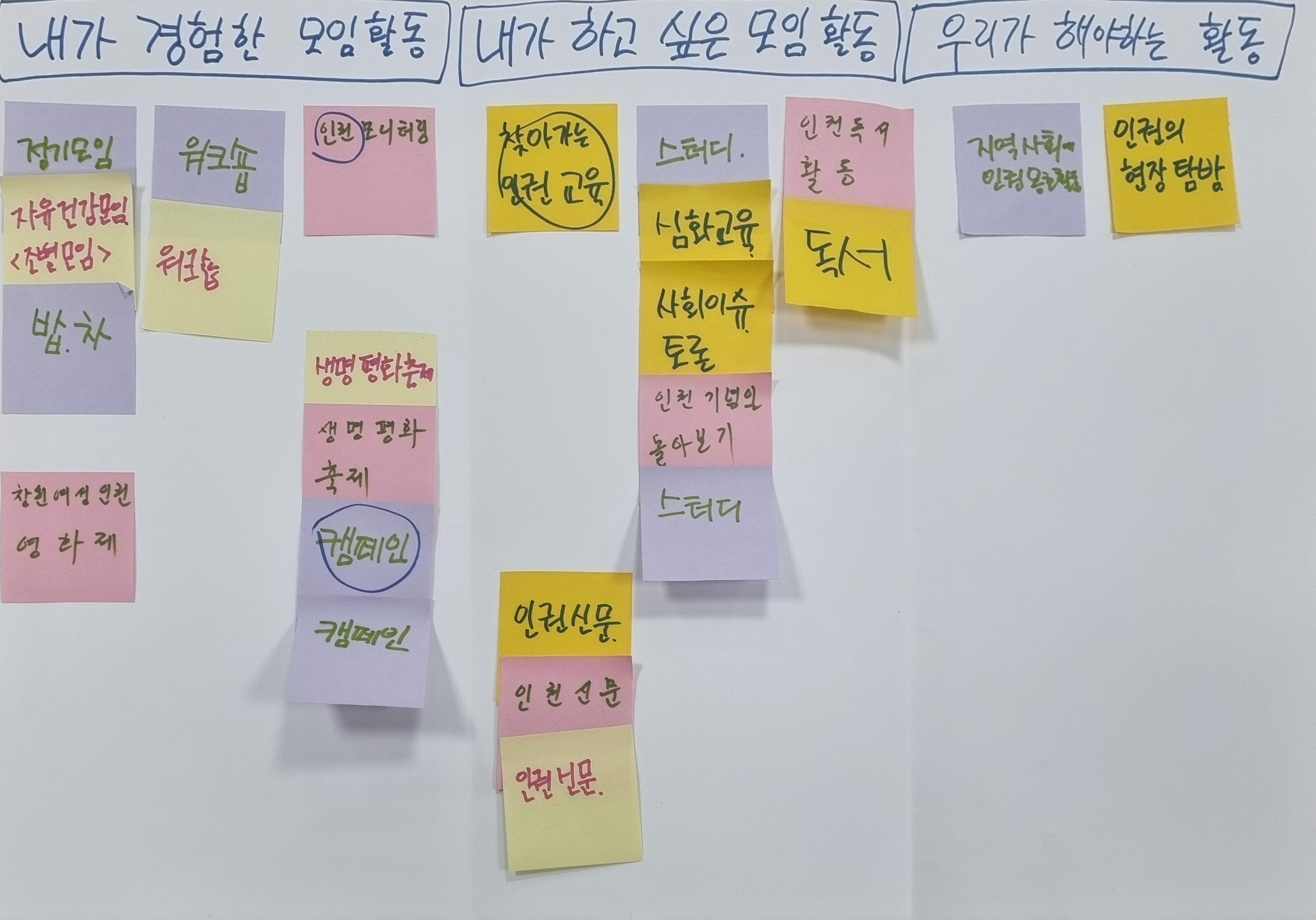 목적문의 문장을 다 완성하지는 못했지만 내가 경험한 모임활동, 내가 하고 싶은 모임활동, 우리가 해야하는 활동을 공유하고 정리해보는 의미있는 시간이었습니다. 이후 정기모임을 통해 문장을 완성하는 시간을 가지기로 하고 2023년 부엉이의 날개짓이 시작되었습니다.