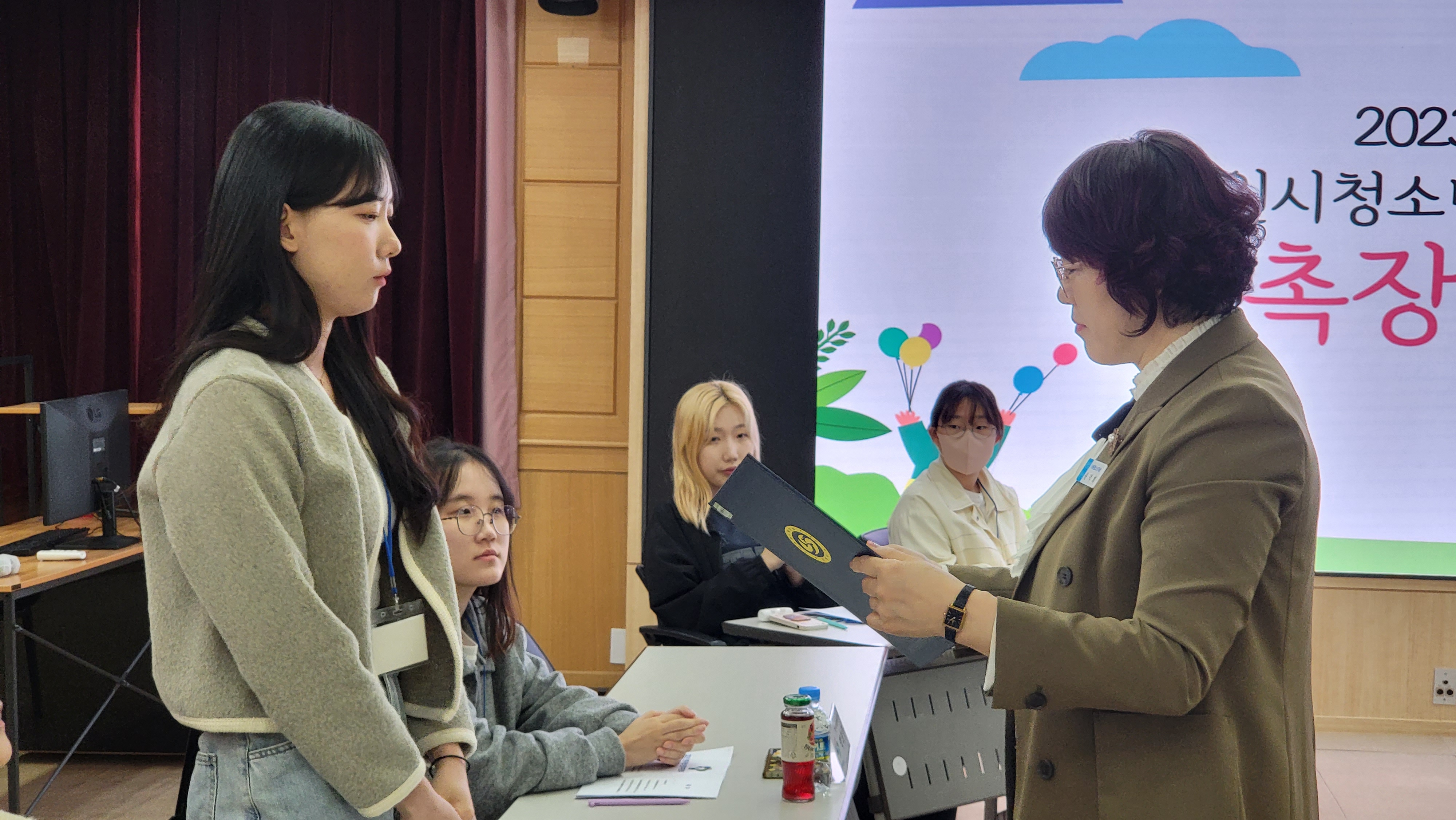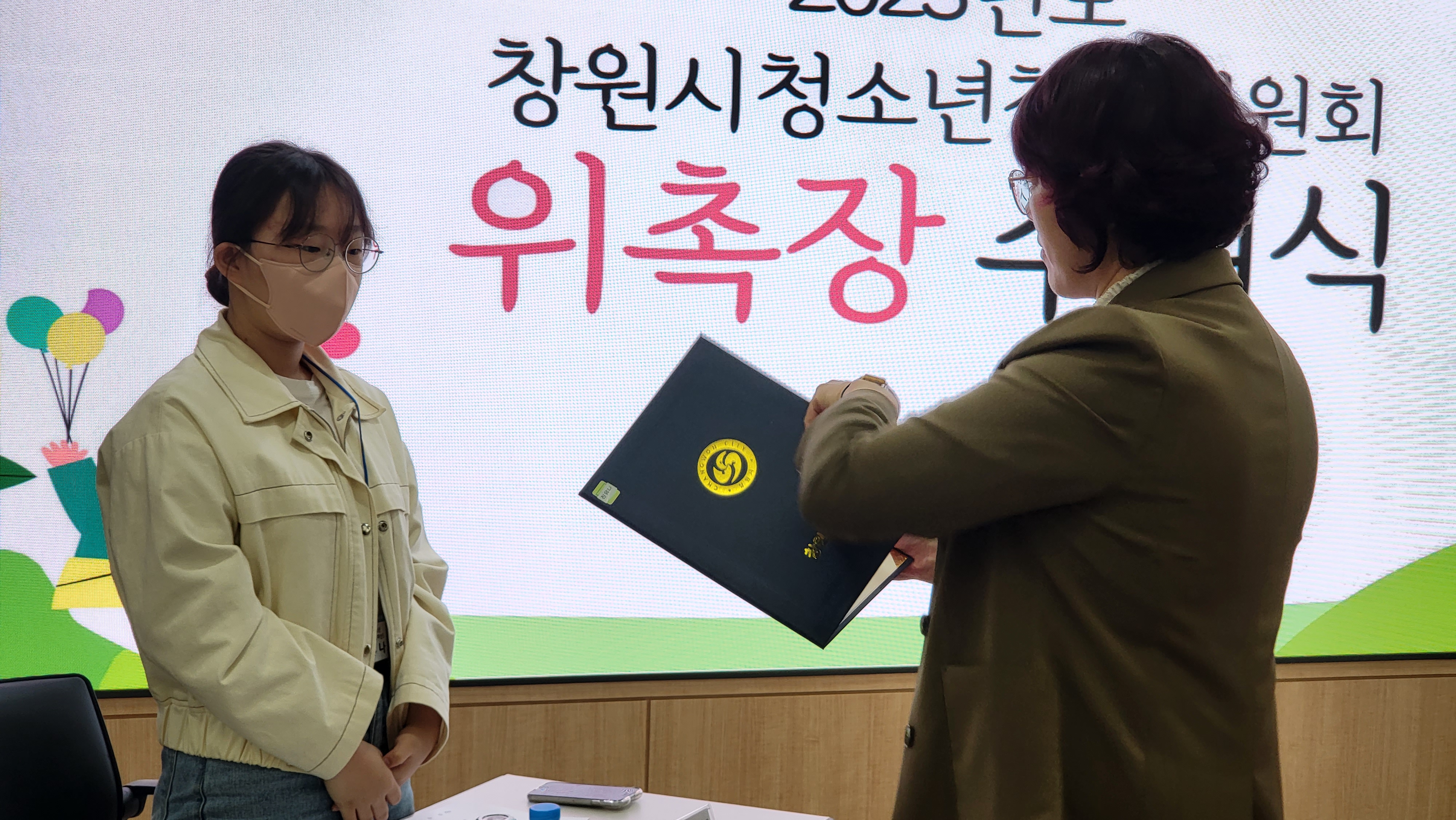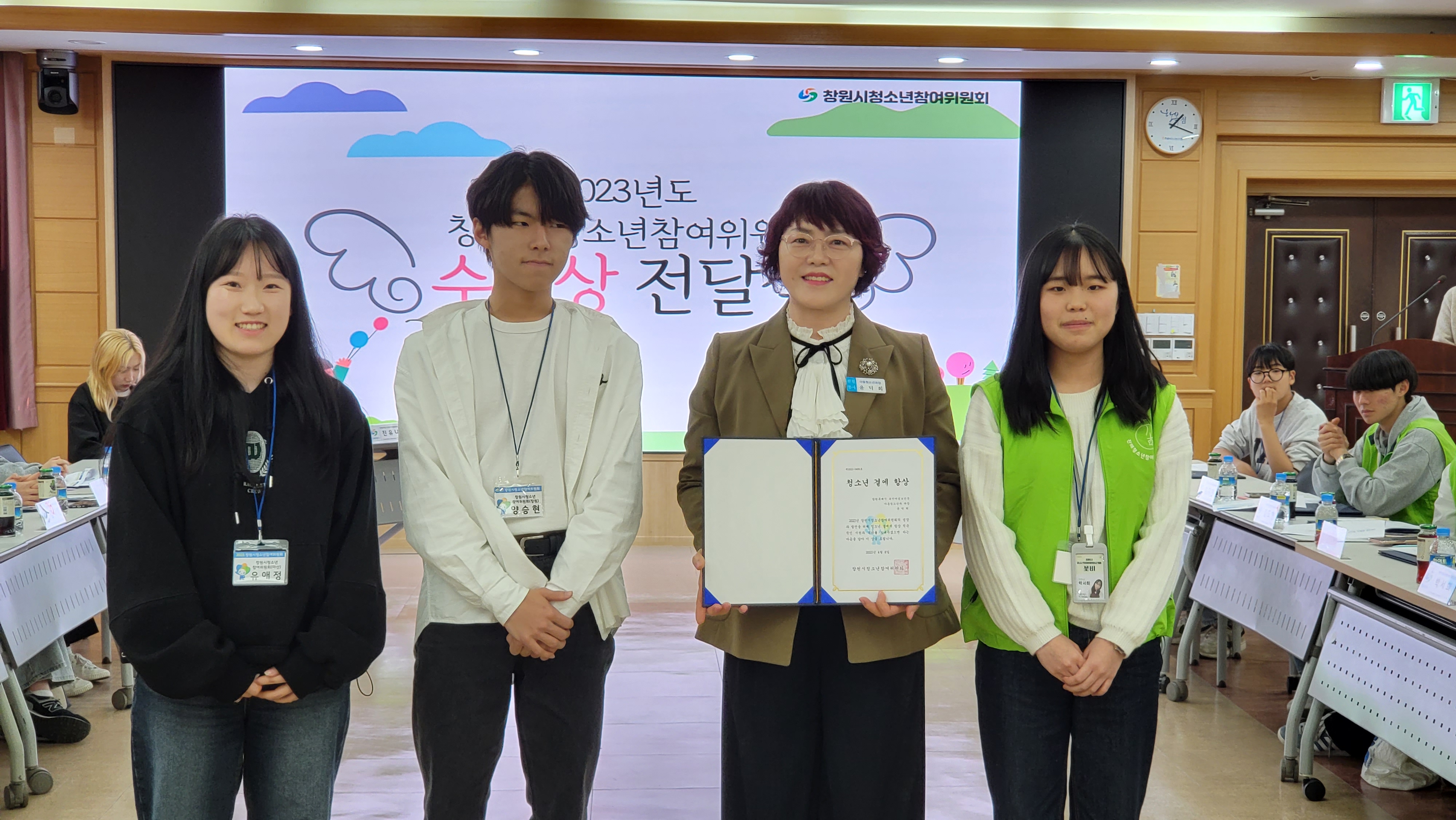 창원시 아동청소년 과장님이 참석하여 2022년 우수위원 표창장 수여와 함께 2023년 참여위원들에게 위촉장 전달을 해주시며 격려와 응원의 인사말씀을 해주셨습니다. 참여위원들도 준비해온 '수호상'을 아동청소년과장님에게 전달해 드렸고 2023년 청소년참여위원회 담당 실무자들의 소개와 지역분과별 참여위원들 소개 그리고 창원시 청소년정책에 대해 간략하게 들어보는 시간을 가졌습니다.