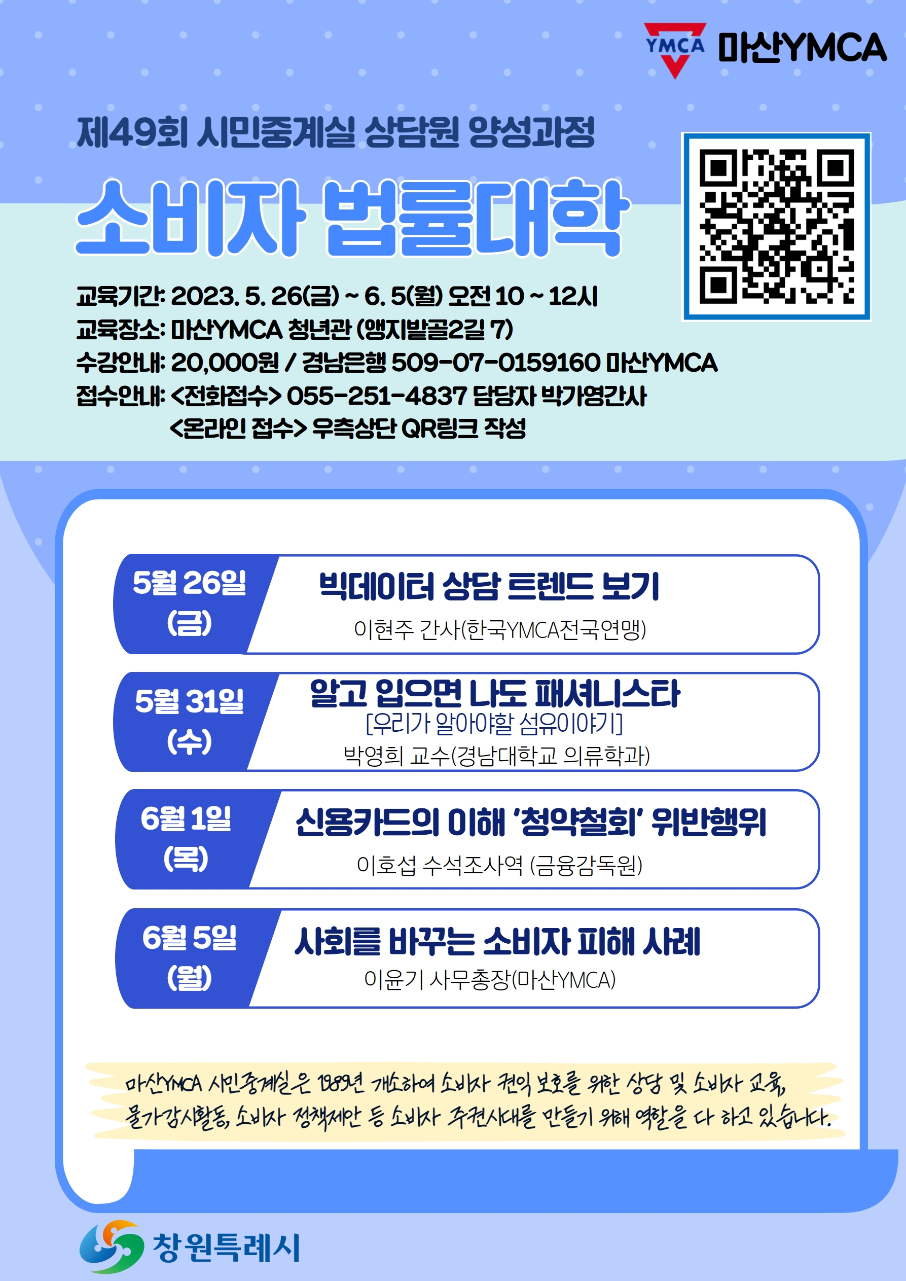 마산YMCA 시민중계실은 다양한 강의와 나눔으로 지역의 소비 피해를 줄이고, 현명한 소비자 양성을 통해 다양한 소비자 운동을 진행하고 있습니다.