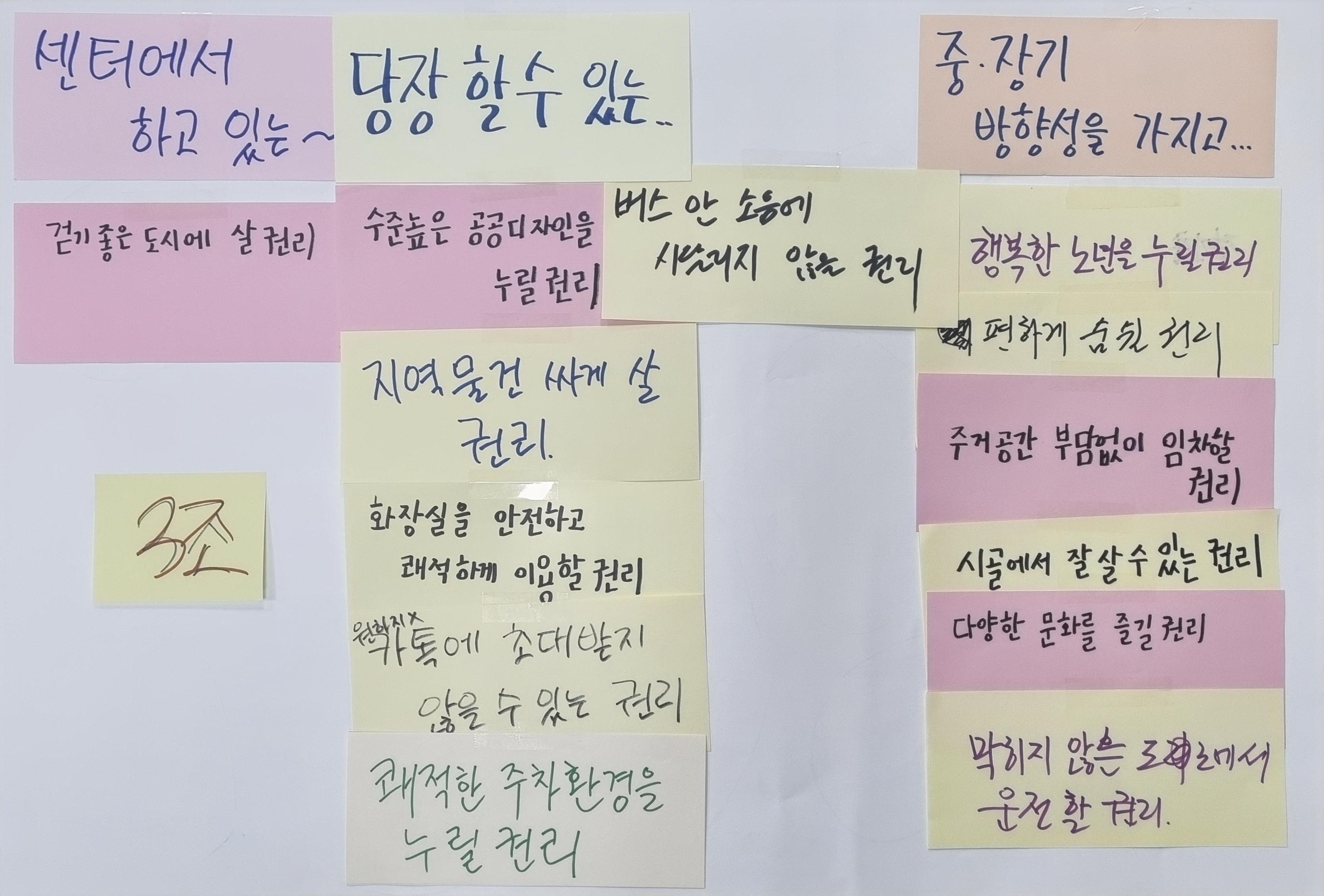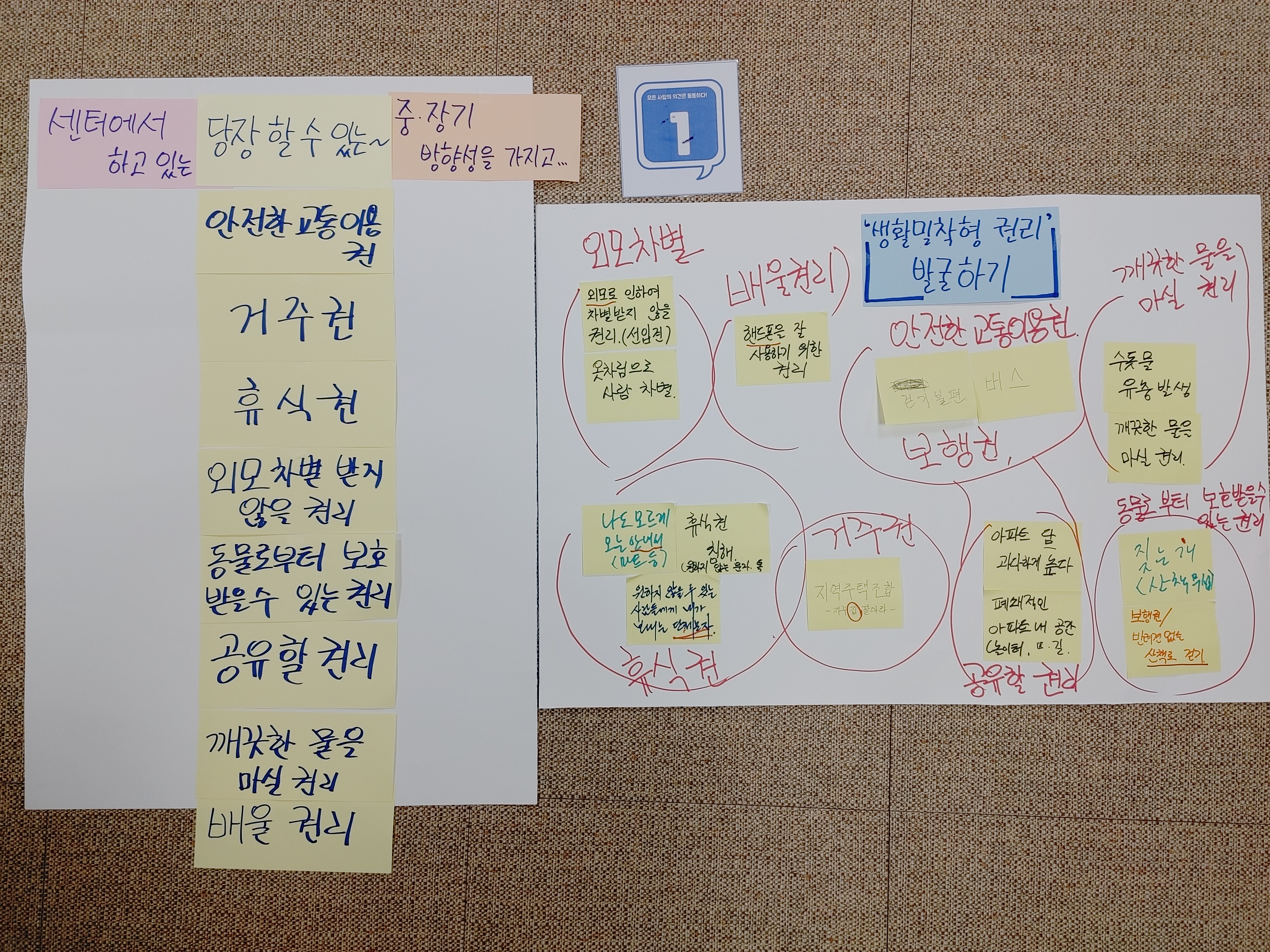 옷차림으로 사람 차별, 걷기 불편, 아파트 담 과다하게 높다, 창원시청 광장 조경이 별로입니다, 세금이 어려워요, 남편과 있을 때 친절한 사람들 등 정말 많은 일상이 공유되었습니다. 공유된 일상을 조금 더 인간답게 살아가기 위한 '생활밀착형 권리'로 발굴해 보고 센터에서 하고 있는, 당장 시도할 수 있는, 중·장기 방향성을 주제로 분류도 진행했습니다.