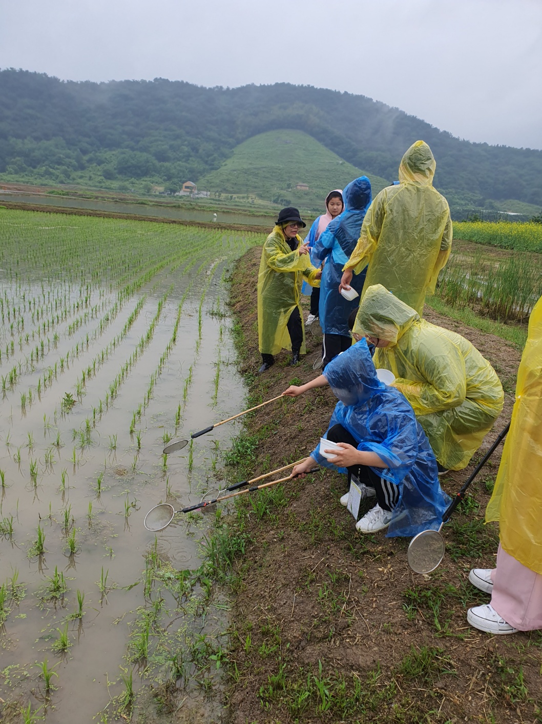 수서곤충채집을 할 때 갑자기 비가 많이 와서 활동이 진행될 수 있을까하는 걱정과 안전의 염려가 있었는데, 아이들의 의지를 꺾을 수 없었습니다. 아이들은 비가 오는 것에 개의치 않고 직접 곤충을 채집하는 것에 엄청난 집중과 흥미를 보였는데, 매우 즐거워했습니다. 뜰채를 이용해 논에 있는 하루살이, 물방개, 풍년새우 등을 잡고 한 곳에 모아 어떤 생물인지 다 같이 확인하고 관찰하는 시간을 통해 지식을 배우고 친구들과 함께하면서 아이들이 매우 만족했음을 알 수 있었습니다. 웃음꽃이 가득 피어납니다. 비가 너무 많이 와서 짧은 시간 동안 진행할 수밖에 없어서 조금의 아쉬움을 남긴 활동이었습니다.
