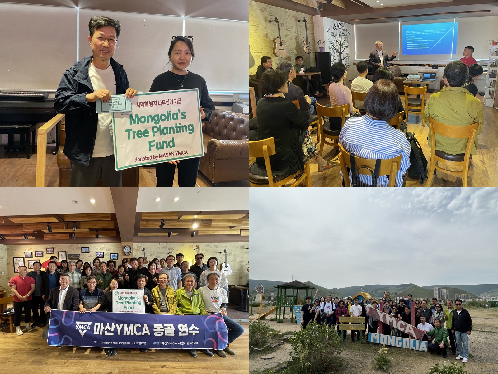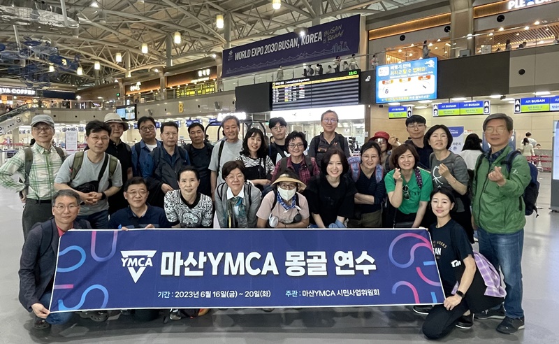 | 마산YMCA 시민사업위원회 몽골연수 기간: 2023년 6월 16일부터 21일까지 4박 6일 장소: 몽골YMCA, 울란바트르, 미니 사막, 테를지 국립공원 등 참가자: 고효빈, 김민정, 김재현, 김정하, 김태석, 박수연, 박유경, 백은석, 신삼호, 이경수, 이서희, 이승준, 이영호, 이윤기, 이인안, 이종호, 이지순, 이지원, 정규식, 정민교, 정은희, 조정림, 조정순, 차윤재, 한지선, 허정도,황옥자 (이상, 27명) |