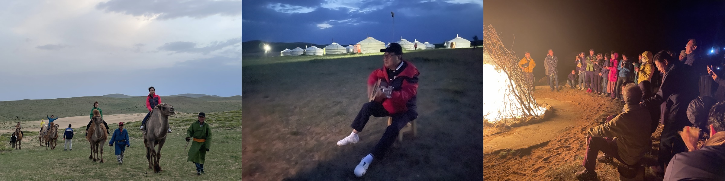 저녁은 게르에서 현지식으로 간단히 했다. 이곳은 물이 귀해 샤워나 화장실 이용이 조금 불편하다. 가이드가 남자들은 샤워를 하지 않는 것이 좋을 거라는 엄포(?) 때문인지 거의 안한 것 같다. 깜깜한 밤이 되어도 날이 흐려 별빛이 거의 안보였지만 캠프파이어가 10시에 시작되고 이종호 위원의 기타 반주로 분위기가 달아올랐다. 모래바람이 불고 사방으로 지평선만 보이는 초원에서 대자연의 분위기를 한껏 즐겼다. 불과 바람, 술과 노래와 춤이 어우러진 잊을 수 없는 축제의 밤이었다.(1부 끝)