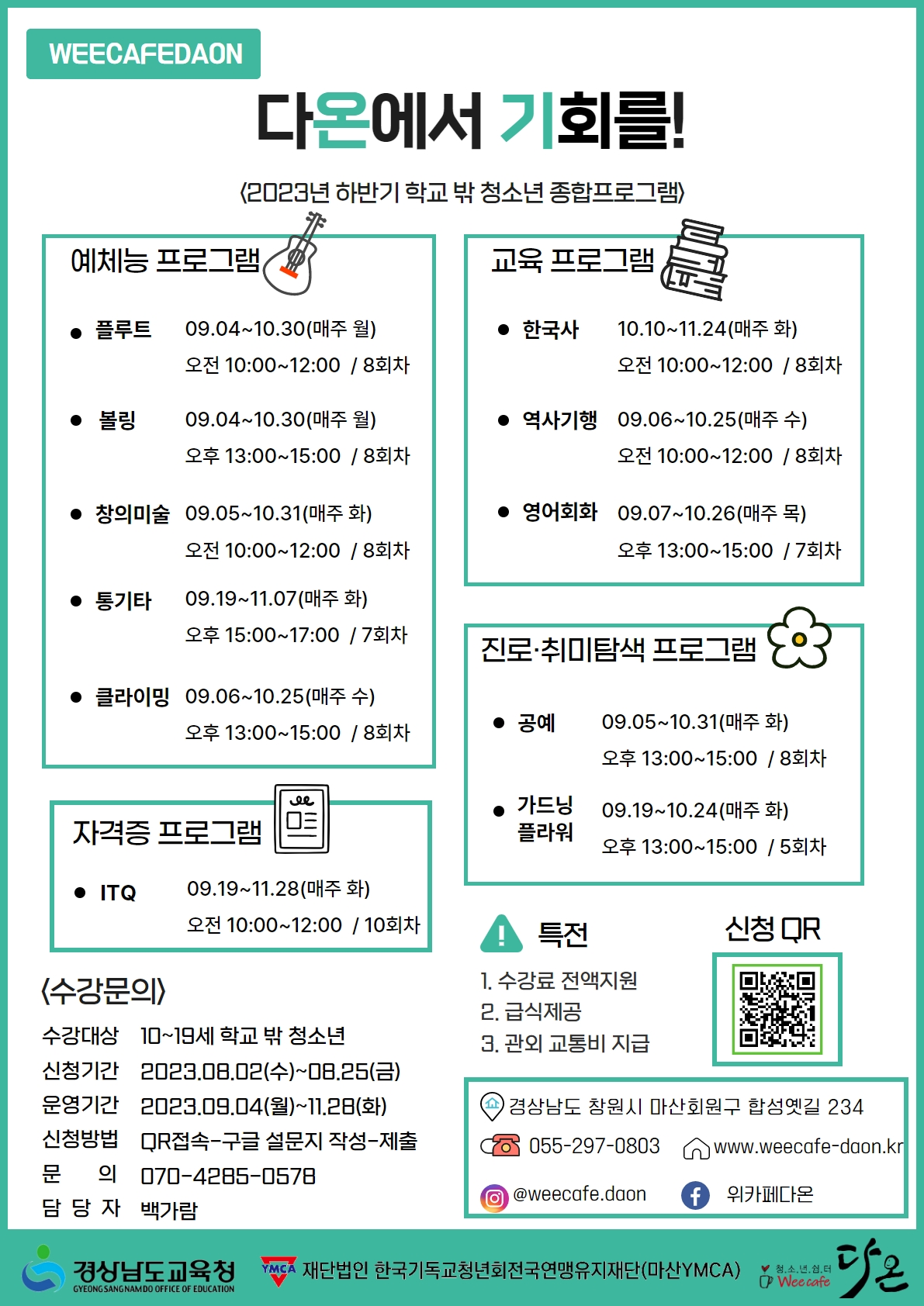 하반기에는 상반기에 인기가 좋았던 창의미술, 통기타, 클라이밍, 역사기행, ITQ자격증과 함께