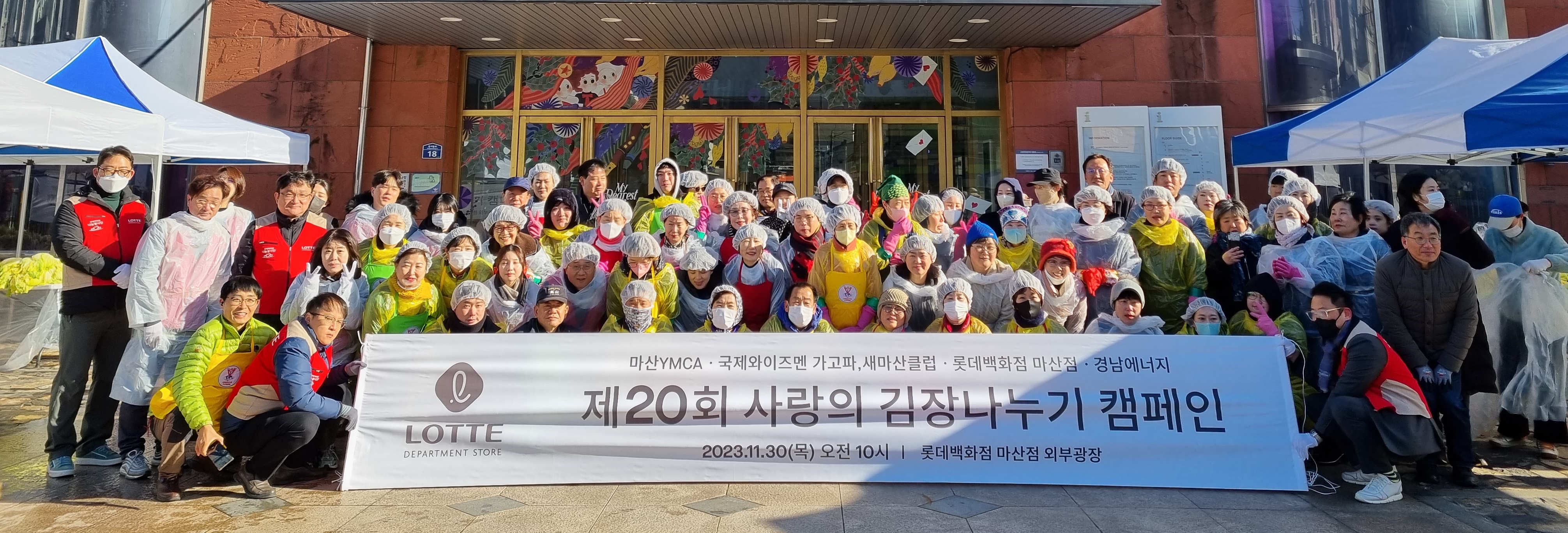 11월 30일, 롯데백화점 마산점 정문 앞에서 20회 사랑의 김장나누기 행사를 진행했습니다. 함께한 단체가 많아 매년 의미가 더해지고 있는데 마산YMCA가 전체적인 주관을 하고 국제와이즈멘 새마산·가고파 클럽, 롯데백화점 마산점, 경남에너지가 매년 함께하고 있습니다.