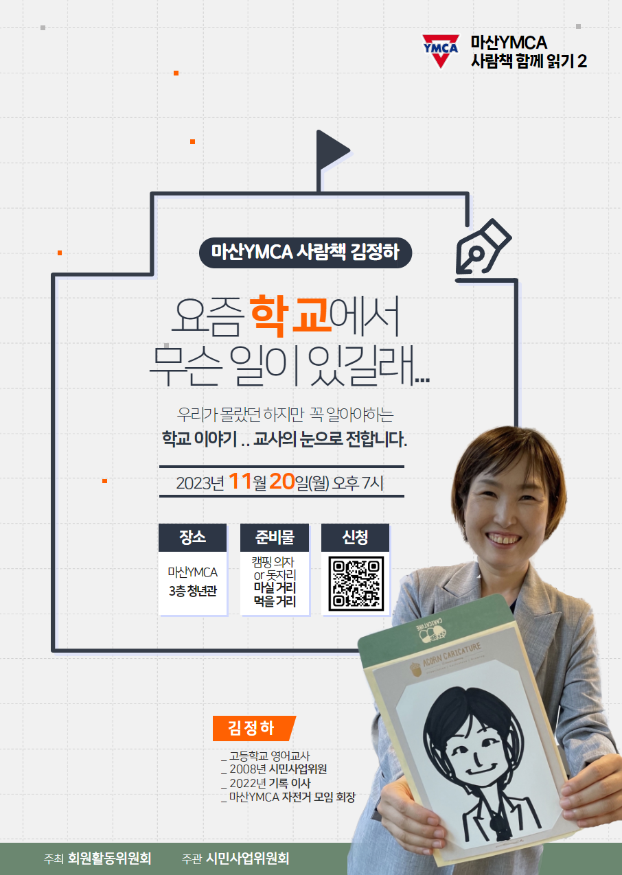 11월 20일 ‘마산YMCA 사람책 함께 읽기’ 두 번째 시간이 진행되었습니다. 첫 번째 사람책은 김인성 전 이사장의 ‘북해도에 살아보니’라는 주제로 진행했습니다. 두 번째 사람 책은 김정하 이사입니다. 김정하 이사는 고등학교 교사이기도 하고 마산YMCA 시민사업위원회 위원이며 기록이사이기도 합니다.