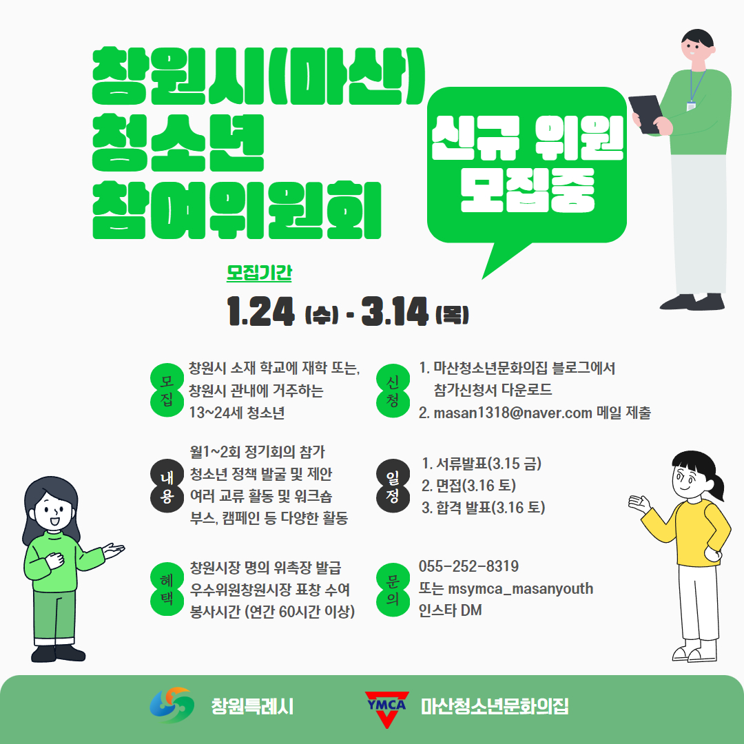마산청소년문화의집에서는 창원시 관내 거주하거나 창원소재 학교에 재학중인 13~24세 청소년을 대상으로 20기 저요!창원시(마산)청소년참여위원회 신규위원을 모집중입니다 :)