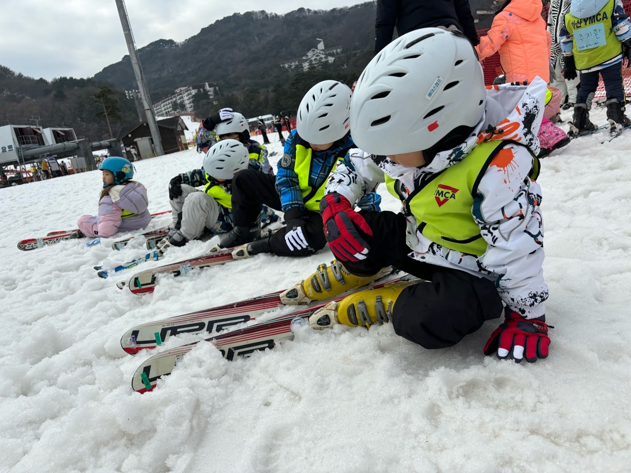 7살에 타본 친구들은 간단한 운동 후 리프트를 타고 올라가 스키강습을 시작했고, 처음인 친구들은 슬로프 아래에서 안전하게 넘어지기 연습을 먼저했습니다.