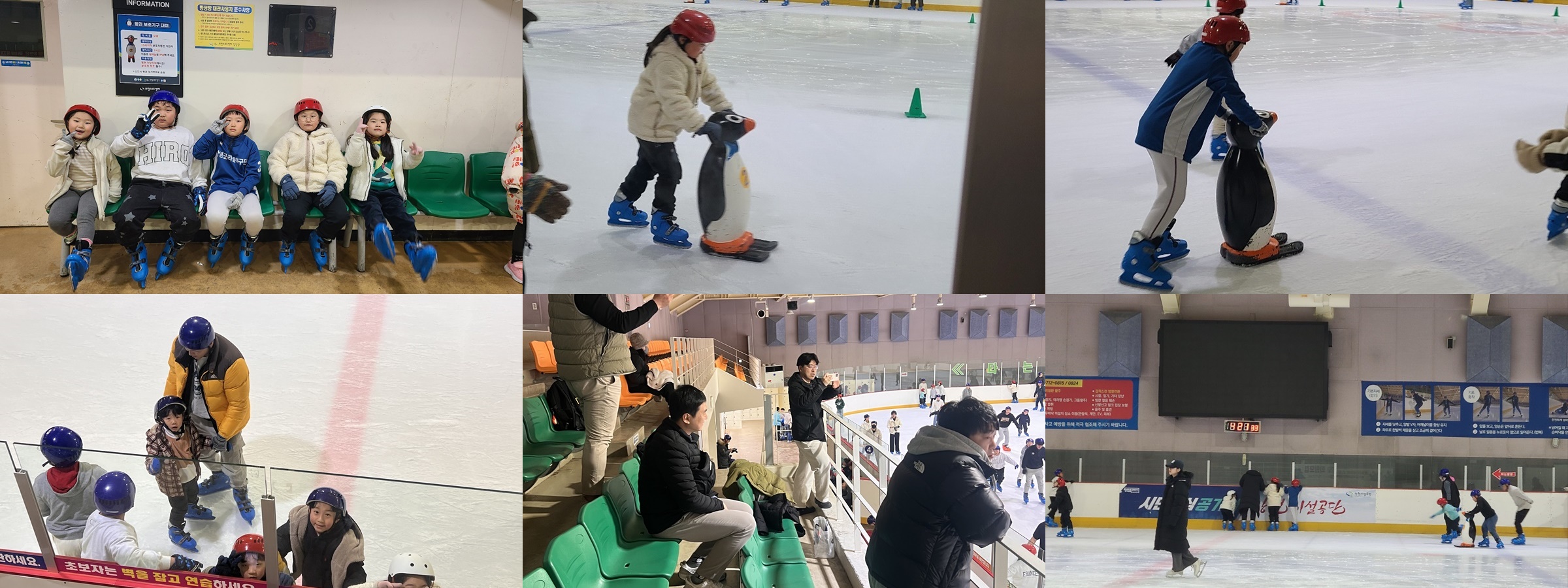 그리고 아이들은 역시나 잘 탔고 즐거워했습니다. 함께 간 아빠들의 모습이 장관이었는데… 아이와 함께 스케이트를 타려고 호기롭게 나섰지만 같은 장소만 빙빙 도는 아빠, 잘가다가 꽈당하는 아빠, 넘어지면 빙상장이 깨진다며 스케이트장 출입조차 않는 좋은(?) 아빠, 스케이트 보조기구(펭귄)에 매달린 아빠, 그리고 그 모습에 신나하는 아이들이 있었습니다.