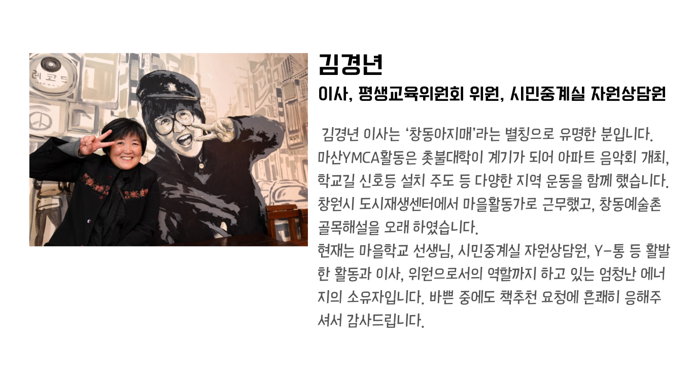 추천: 김경년(마산YMCA 이사, 평생교육위원회 위원, 시민중계실 자원상담원)