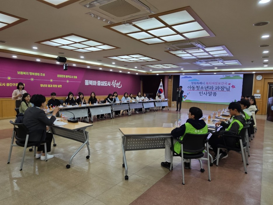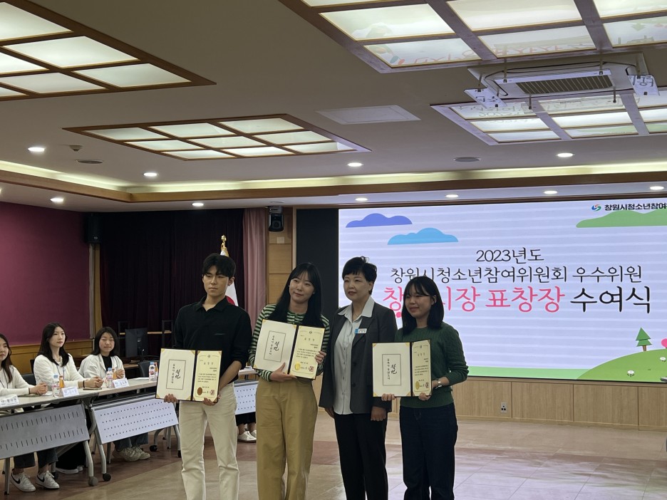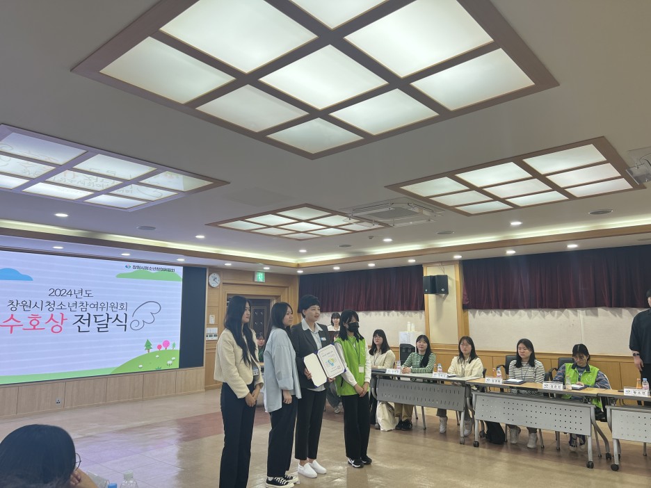 창원시 아동청소년 과장님이 참석하여 2023년 우수위원 표창장 수여와 함께 2024년 참여위원들에게 위촉장 전달을 해주시며 격려와 응원의 인사말씀을 해주셨습니다. 참여위원들도 준비해온 '수호상'을 아동청소년과장님에게 전달해 드렸고 2024년 청소년참여위원회 담당 실무자들의 소개와 지역분과별 참여위원들 소개 그리고 창원시 청소년정책에 대해 간략하게 들어보는 시간을 가졌습니다.