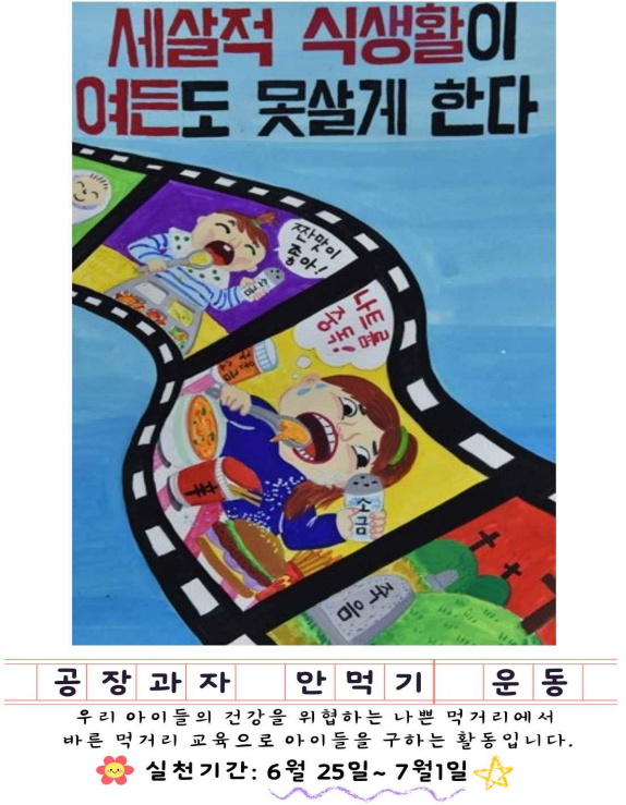 아기스포츠단은 매년 '공장과자 안먹기'활동을 교육 운동의 일환으로 진행해 오고 있습니다. 아이들에게 먹는 것이란 자기 몸과 마음을 만드는 것이기에 어릴 적 기초 교육이 참으로 중요합니다.